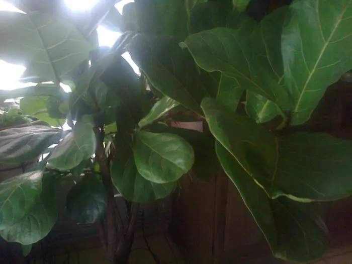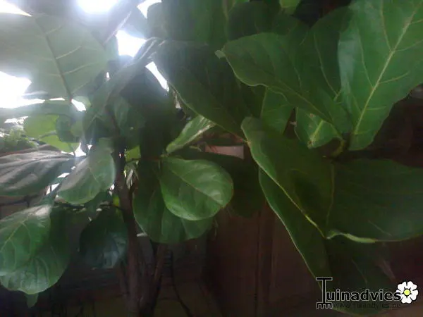 Ficus lyrata vormt een dunne schilferige stam waaraan prachtige grote bladeren groeien.