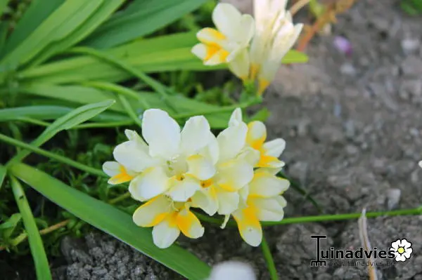 De bloemen staan bovenaan de stengel als een horizontale aar, zijn lichtgeel met een geler vlek op de onderste bloemblaadjes en geuren heerlijk zoet.