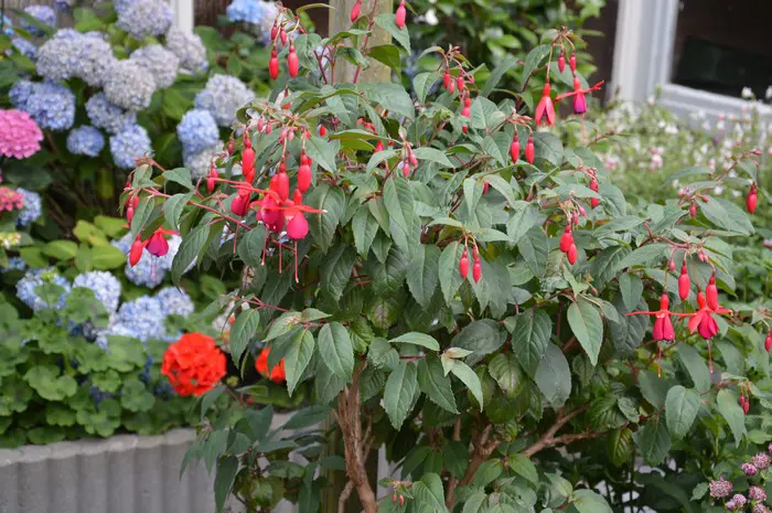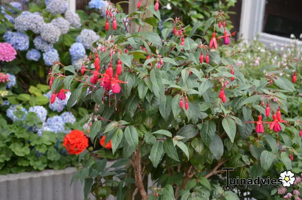 Een rechtopgaand groeiende fuchsia met enkelvoudige bloemen.Donkerrode kelkblaadjes met roodpaarse kroon.
