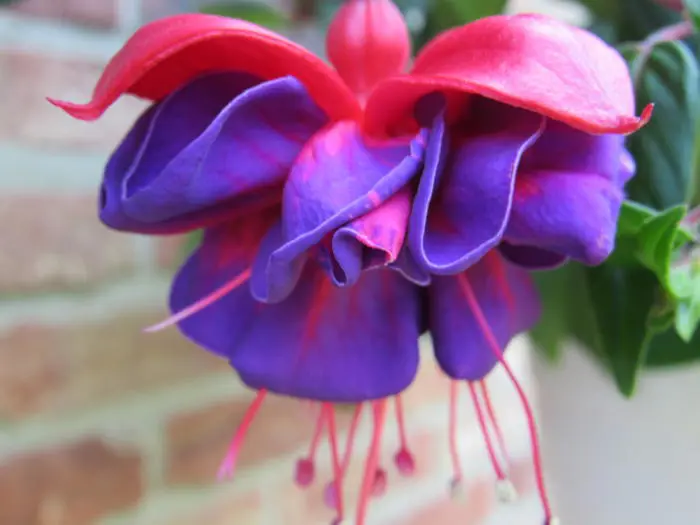 Fuchsia 'Dark Eyes' is een staande bellenplant met dubbele bloemen. Buis en kelkblaadjes zijn dieprood, de kroon violetblauw.