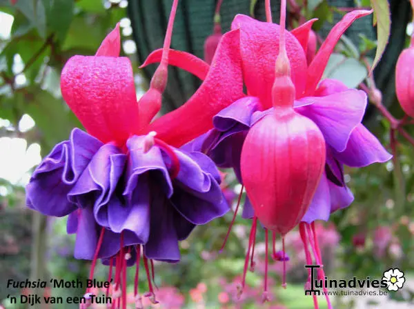 Fuchsia 'Moth Blue' is een hangende bellenplant met middelgrote bloemen.