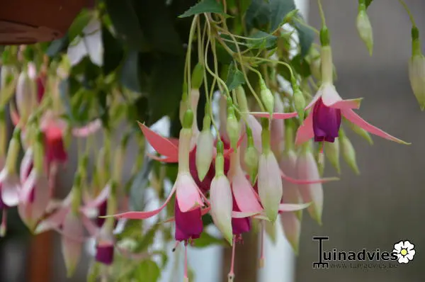 Fuchsia 'President Margaret Slater' is een hangplant die bloeit met klokvormige bloemen, de kroon is licht paars-magenta met witte kelkblaadjes met een zalmroze blos.