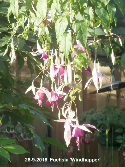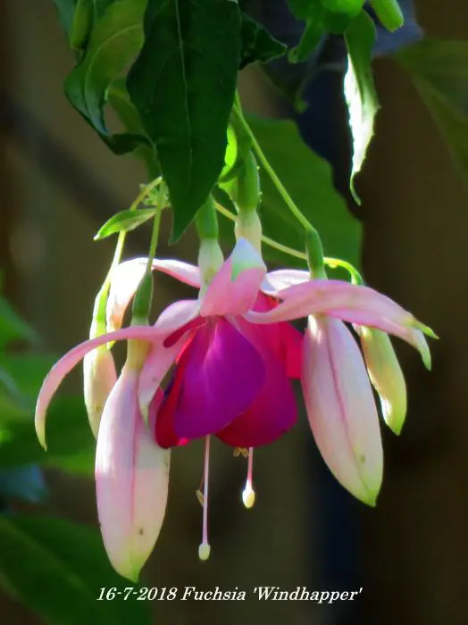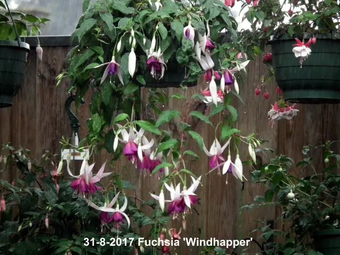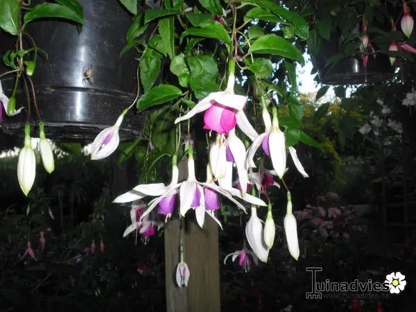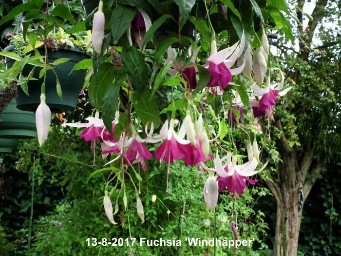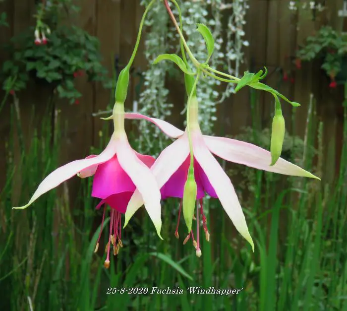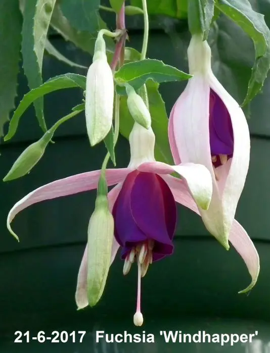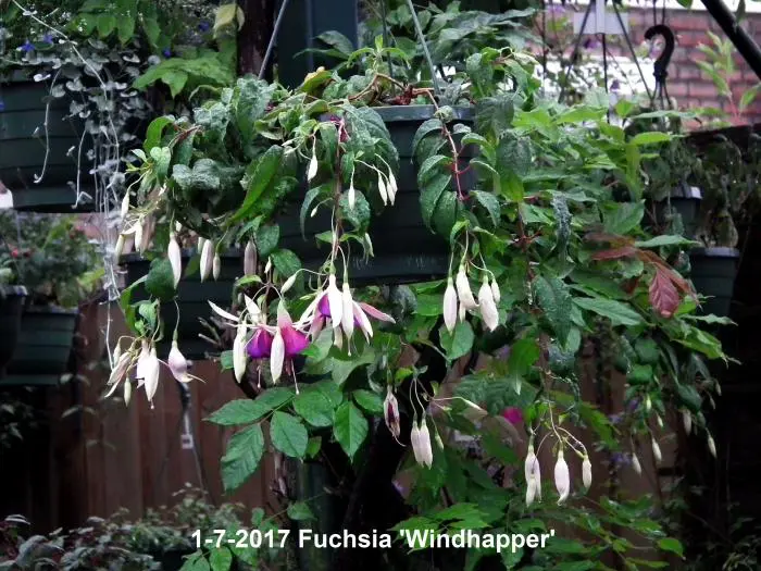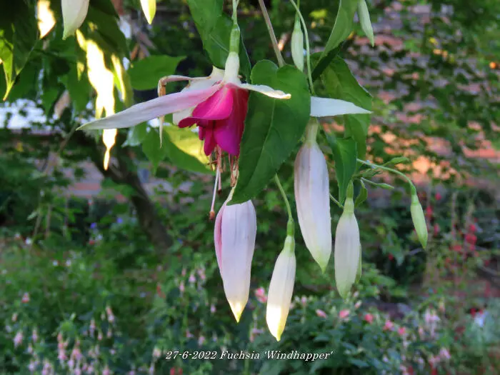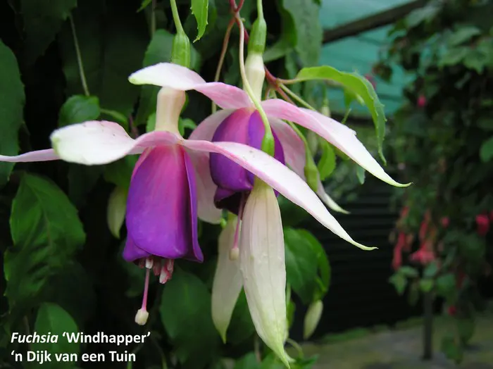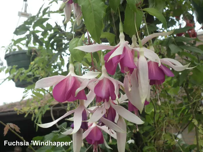 Fuchsia 'Windhapper' is een hangende bellenplant met enkelvoudige bloemen, kelk wit, kroon lilaroze.