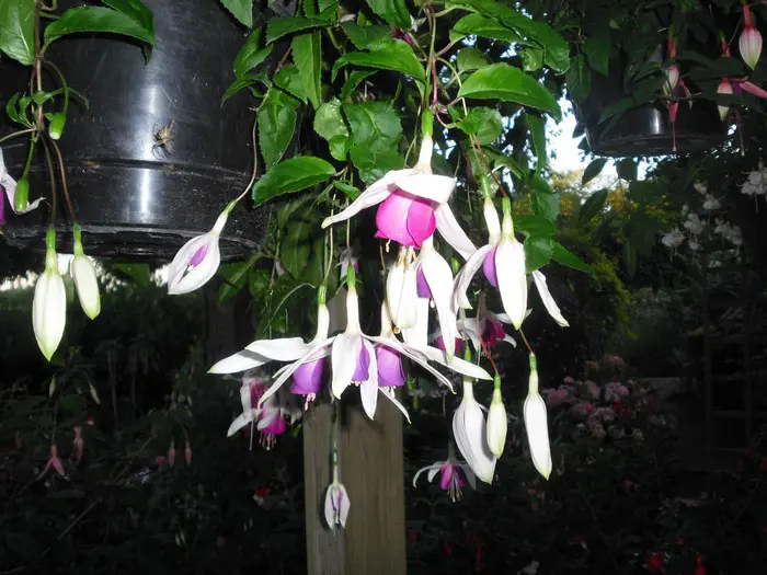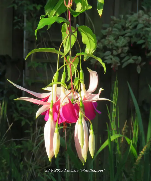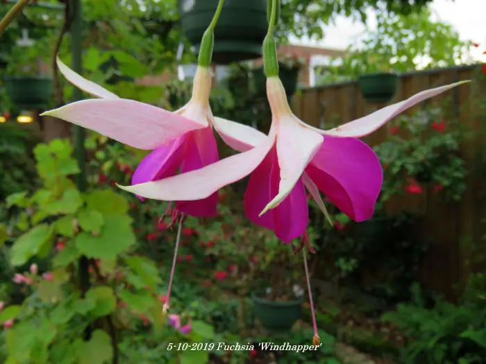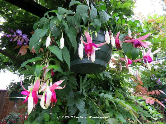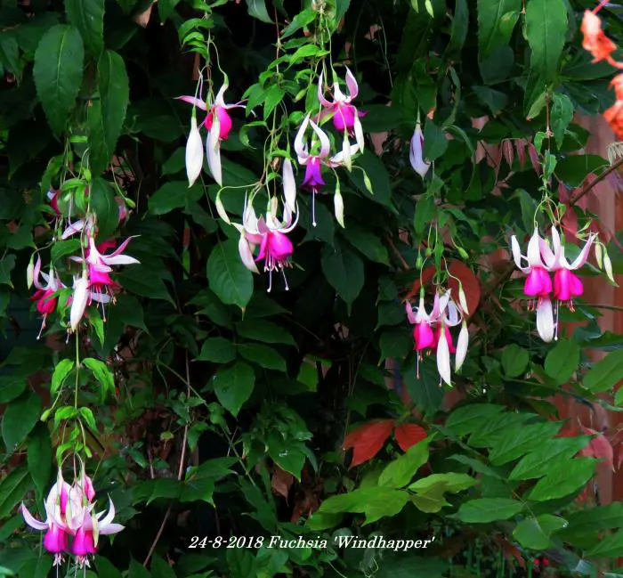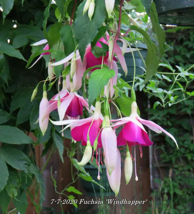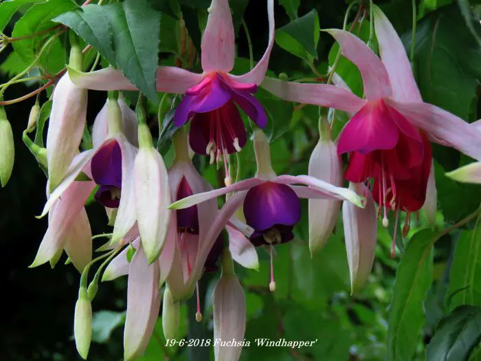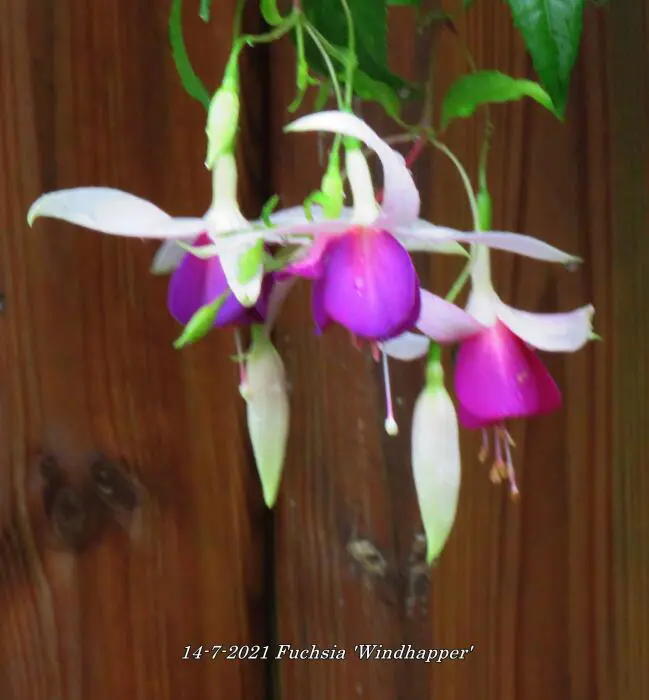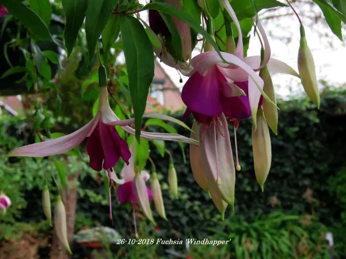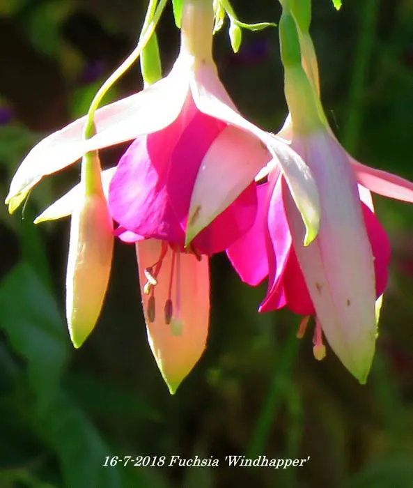 Fuchsia 'Windhapper' is een hangende bellenplant met enkelvoudige bloemen, kelk wit, kroon lilaroze.
