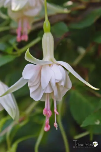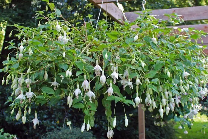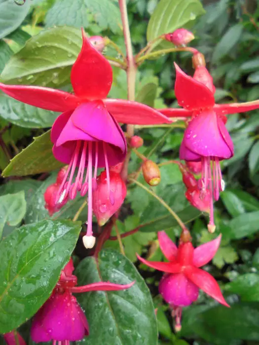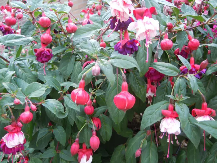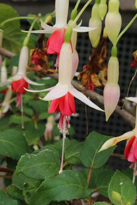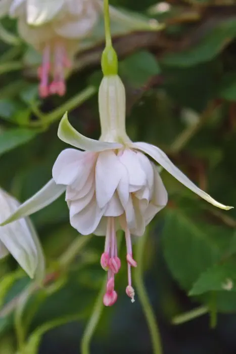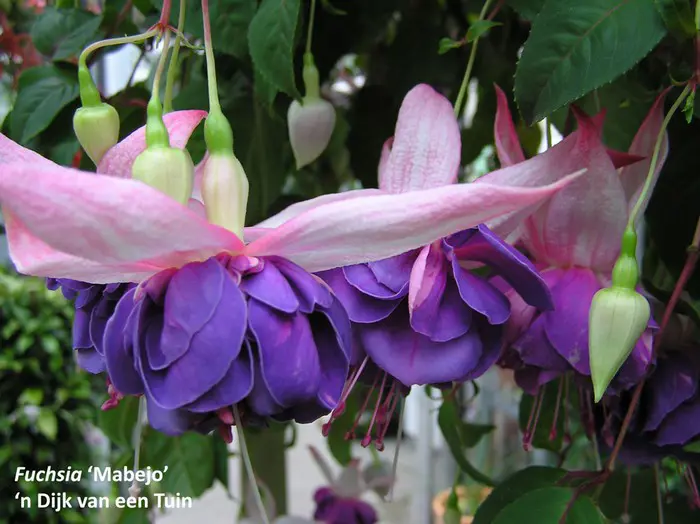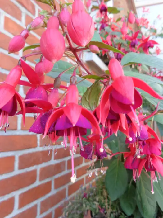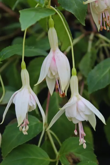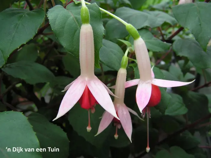 Fuchsia 'Charming' is een opgaand bossige bellenplant met limegroene bladeren en enkelvoudige bloemen. De bloemen hebben rozerode kelkblaadjes en een paarse kroon.