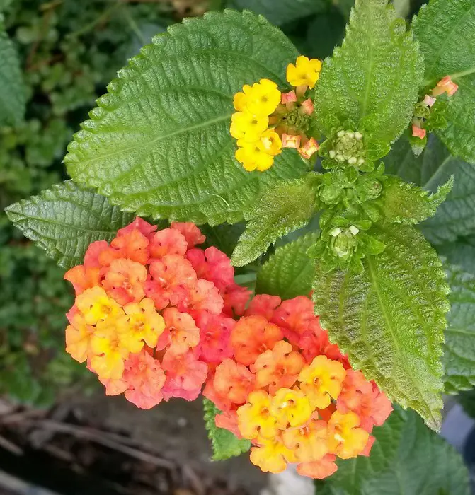 Lantana camara 'Chelsea Gem' heeft een driehoekig, getand, ruw blad en prachtige ronde trosjes van buisvormige oranje/warmgele verkleurende bloemen.