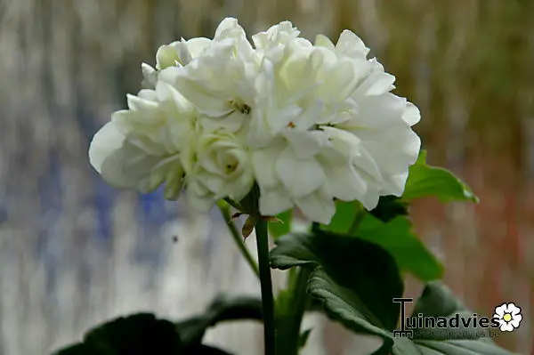 Pelargonium Fantasie is een dwergvorm met dubbele witte bloemen.