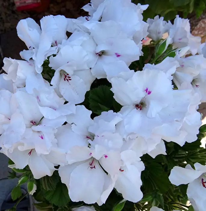 Pelargonium grandiflorum 'Jasmin' bloeit de hele zomer lang. De witte bloemen hebben een roze markering in het midden.
