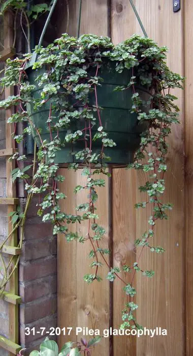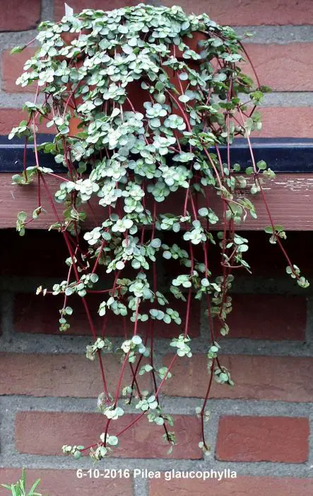 Pilea glaucophylla is een tropische plant met zeer aantrekkelijke, kleine zilvergroene blaadjes aan vlezige rode stengels.