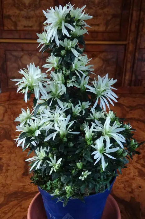 Rhododendron simsii 'MAGICSNOW Winter Beauty' is een kleine kamerazalea met de vorm van een kerstboom.
