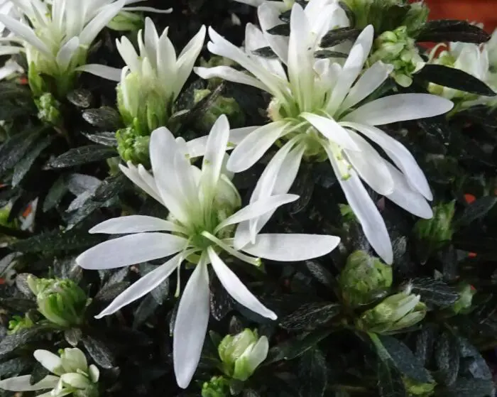Uit groene ronde knoppen bloeien spinachtige witte bloemen. De bloei duurt 4 weken lang tussen half december en half februari.
