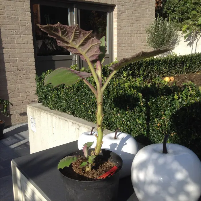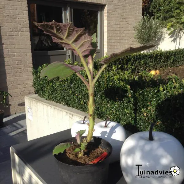 Solanum quitoense afkomstig uit Ecuador, Peru en Z-Colombia is een goed vertakte struik met grote hartvormige, grof getande bladeren. Nieuwe scheuten zijn paars van kleur.
