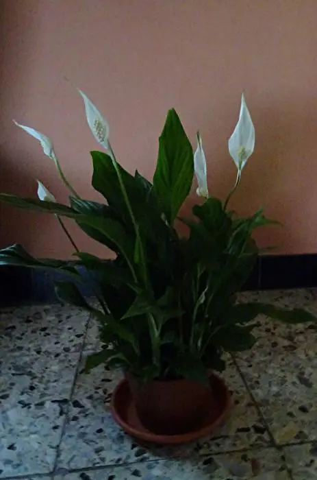 De bloeikolf van Spathiphyllum wordt door een witte bloeischede omschulpt. De lang gesteelde bloemhoofden torenen boven de talrijke, ranke bladeren uit.