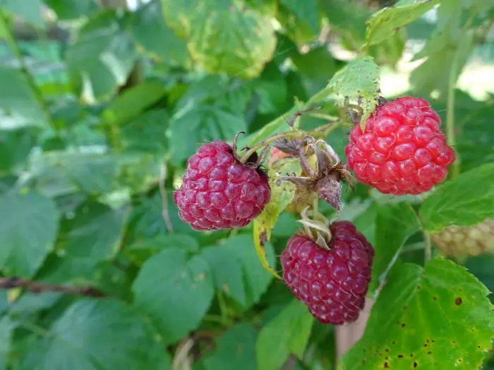 Rubus idaeus 'Himbo top' produceert vanaf begin augustus grote roze frambozen.Zelfbestuivend.