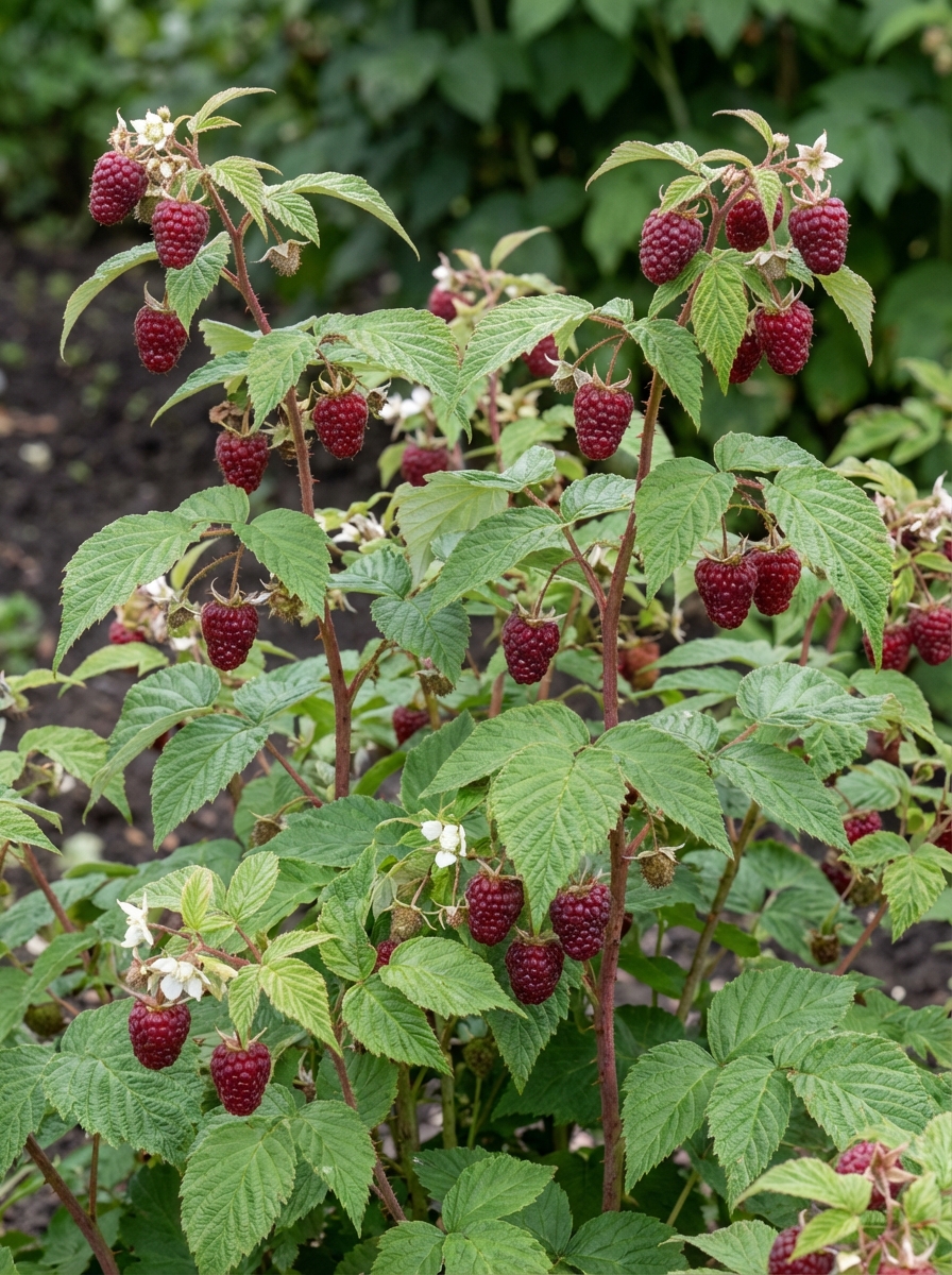 Rubus idaeus 'Sanibelle' (zomerframboos) produceert grote rode vruchten met een goede smaak.