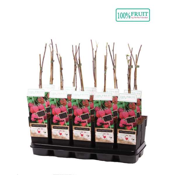 Rubus idaeus Twotimer 'Sugana Red' produceert 2 maal per jaar rode frambozen, in de zomer op het oud hout en later in de herfst op het nieuw oud.