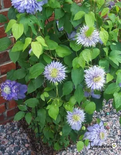Clematis 'Blue Light' (patensgroep) bloeit met violetblauwe bloemen met roomgele meeldraden, dubbelbloemig in het voorjaar en enkelvoudig bij de nabloei.