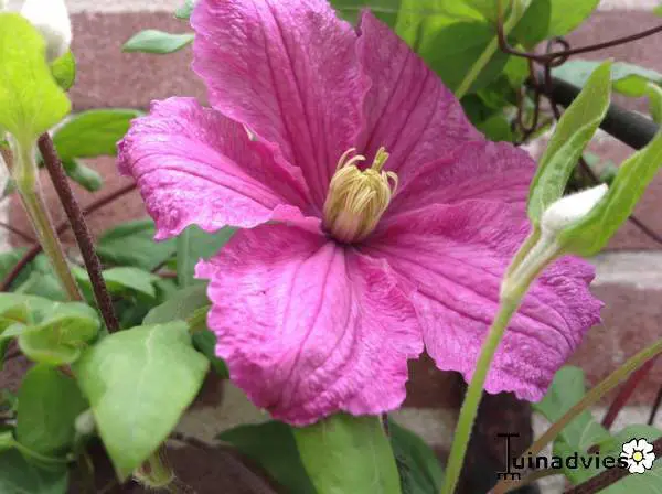 De bloemen van Clematis 'Comtesse de Bouchaud' uit de patens-groep zijn paarsroze met witgele meeldraden.