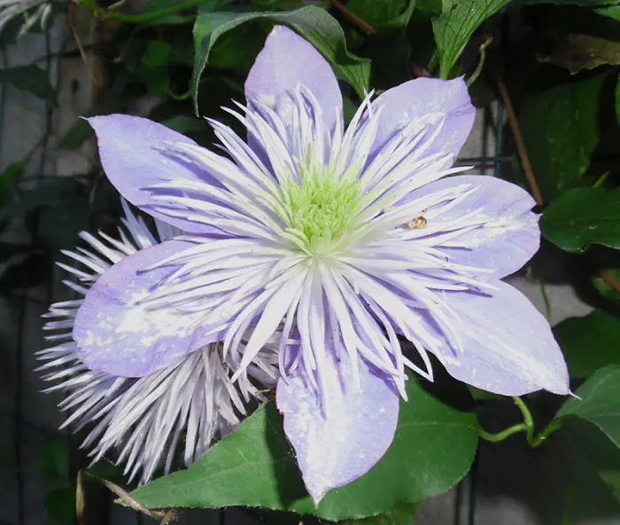 Clematis florida 'Crystal Fountain' bloeit met grote dubbele bloemen met in het centrum opvallende cremewitte meeldraden.