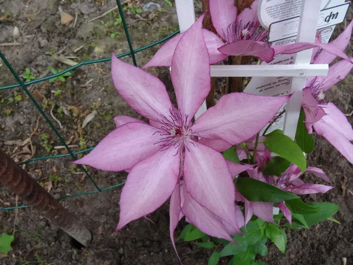 Clematis 'Giselle' is een grootbloemige bosrank met stervormige lilaroze bloemen, donkerroze randen en roodpaars in het centrum met donkere contrasterende meeldraden.