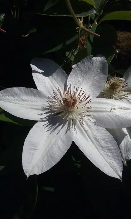 Clematis 'Henryi' (Patens-groep) bloeit met grote wit tot roomwitte bloemen met bruine meeldraden.