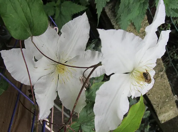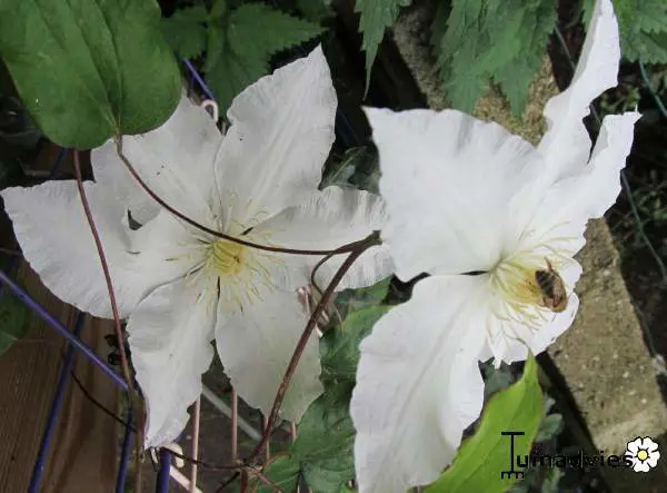 Clematis 'Gladys Picard' (Patens-groep) bloeit met grote lila tot witte bloemen.