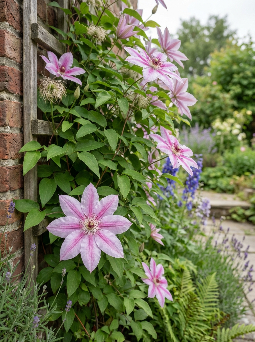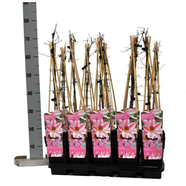 Clematis 'Nelly Moser' is een vroeg grootbloemige uit de lanuginosa-groep met licht paarsroze bloemen die naar wit verkleuren.
