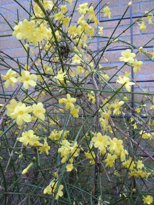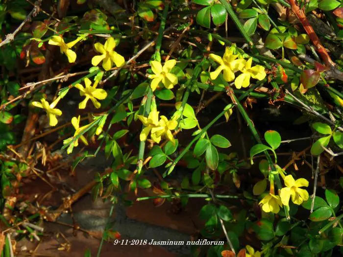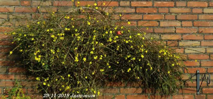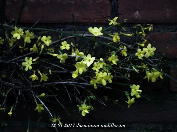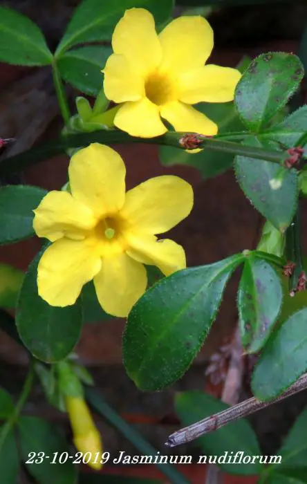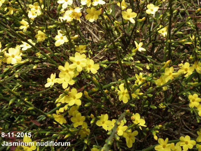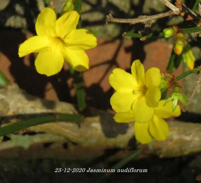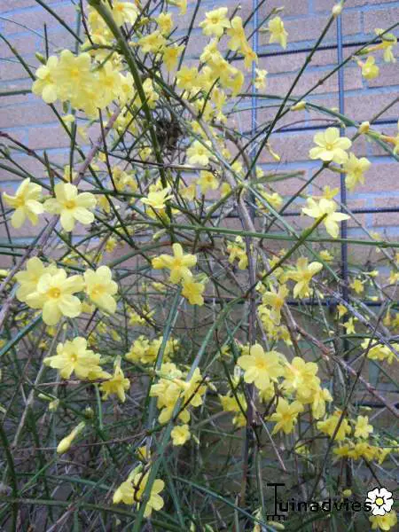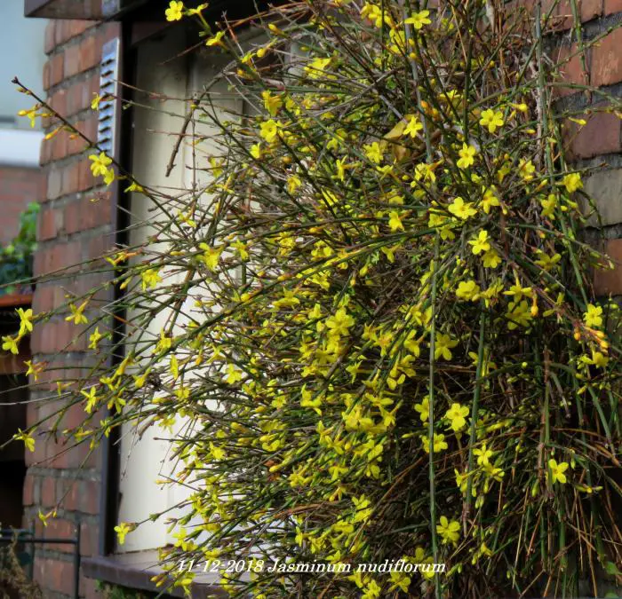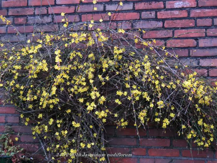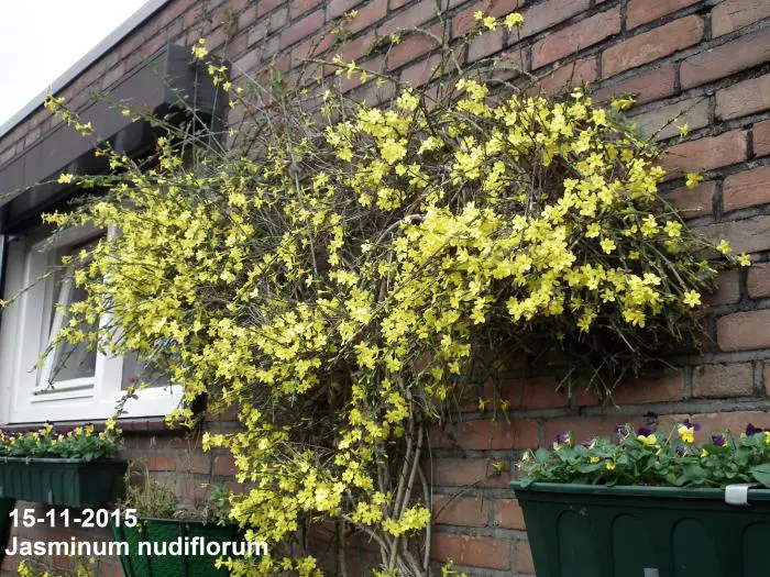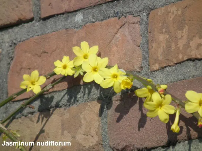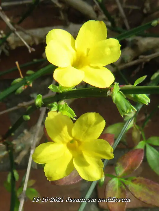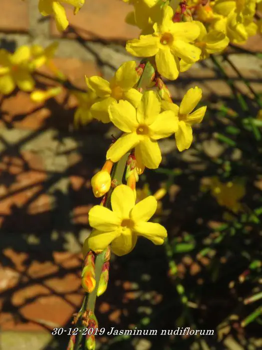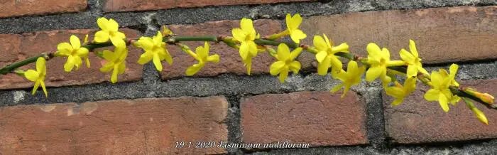 Jasminum nudiflorum is een bladverliezende struik met slanke soepele stengels die soms al vanaf december bedekt zijn met felgele bloemen.