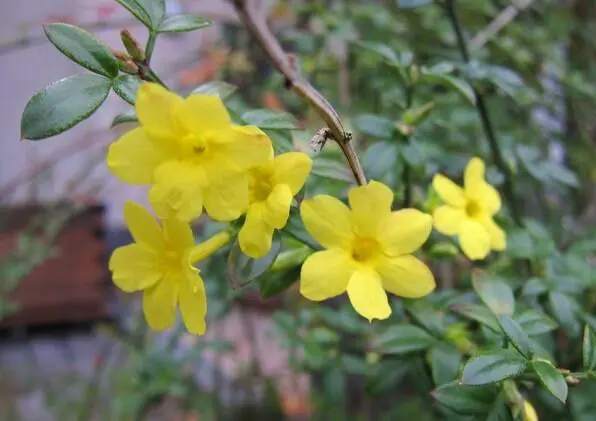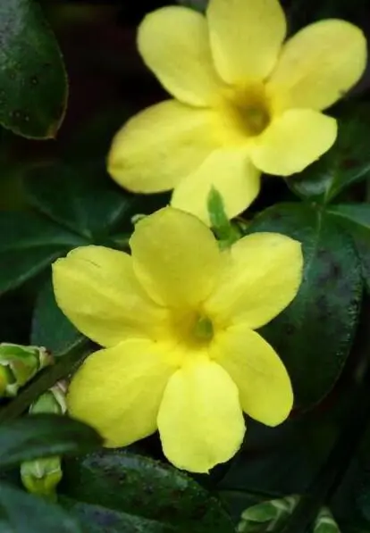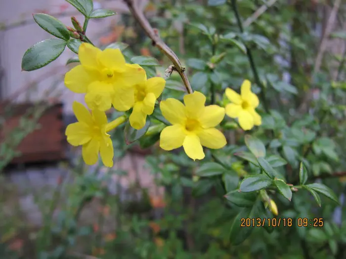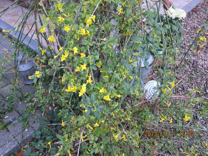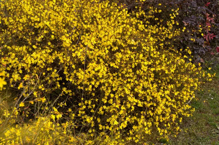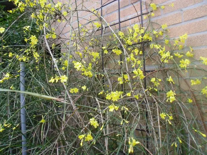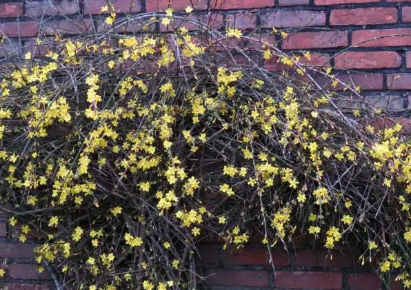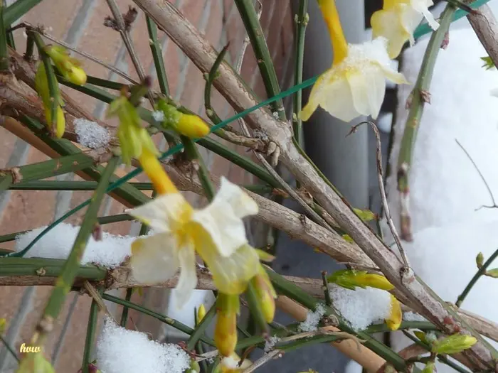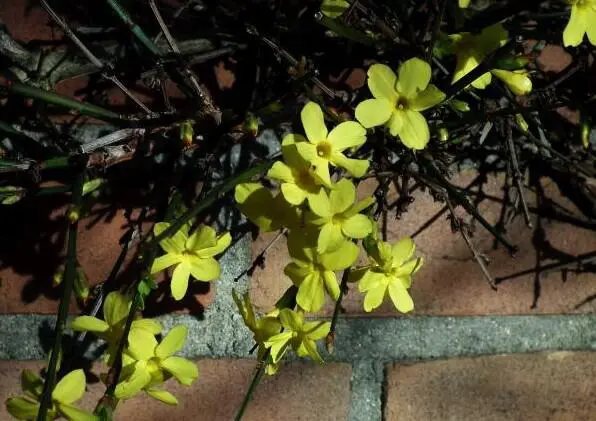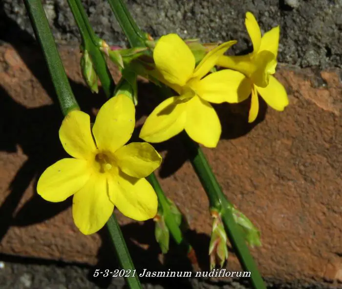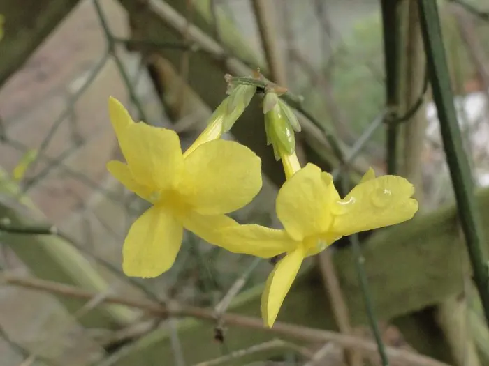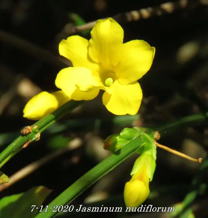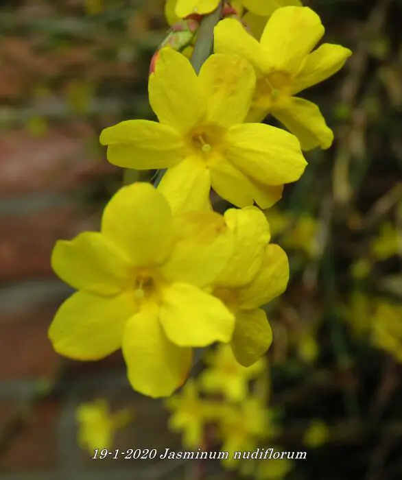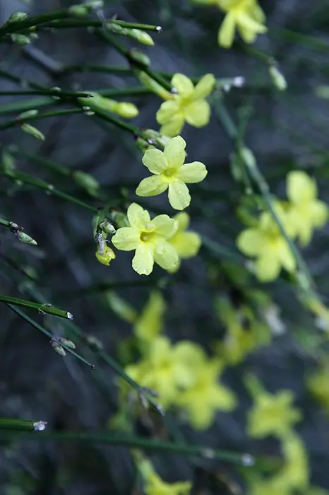 Jasminum nudiflorum is een bladverliezende struik met slanke soepele stengels die soms al vanaf december bedekt zijn met felgele bloemen.