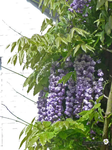 Wisteria floribunda 'Black Dragon' met rechtswindende ranken (met de wijzers mee) en bloeit met lange bloemtrossen tot 50cm lang, gevolgd door giftige zaaddozen. De dubbele bloemen van deze variëteit kleuren van lichtblauw naar donkerviolet en geven een aantrekkelijke schakering.