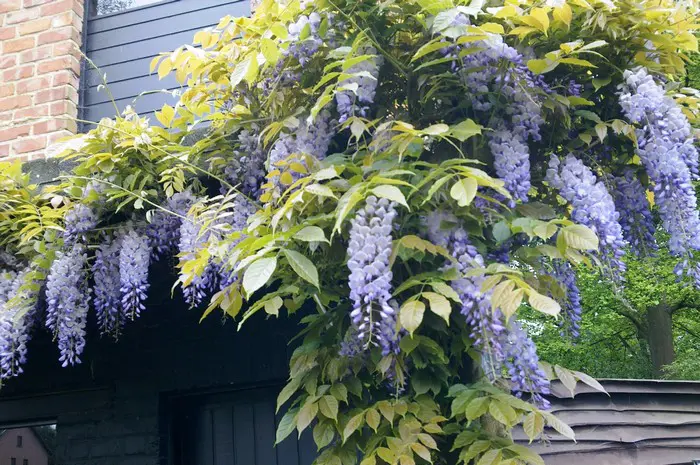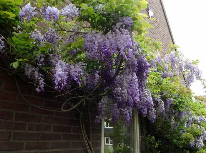 Deze Japanse blauwe regen is rechtsdraaiend, wordt minder hoog en bloeit rijkelijk met kortere bloemtrossen.