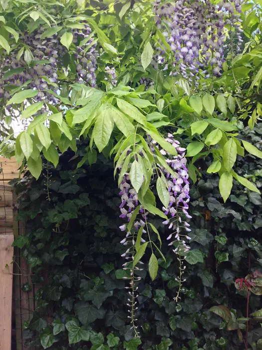 Deze Japanse blauwe regen is een rechtsdraaiende soort, dus met de wijzers mee. Het is een krachtige groeier met lichtgroene tot olijfgroene geveerde bladeren.