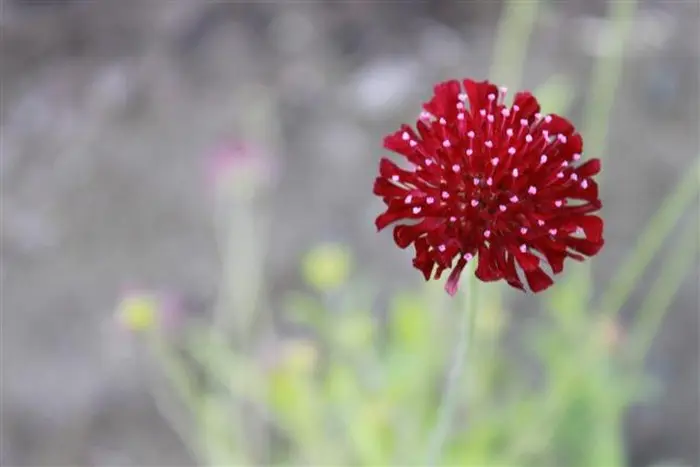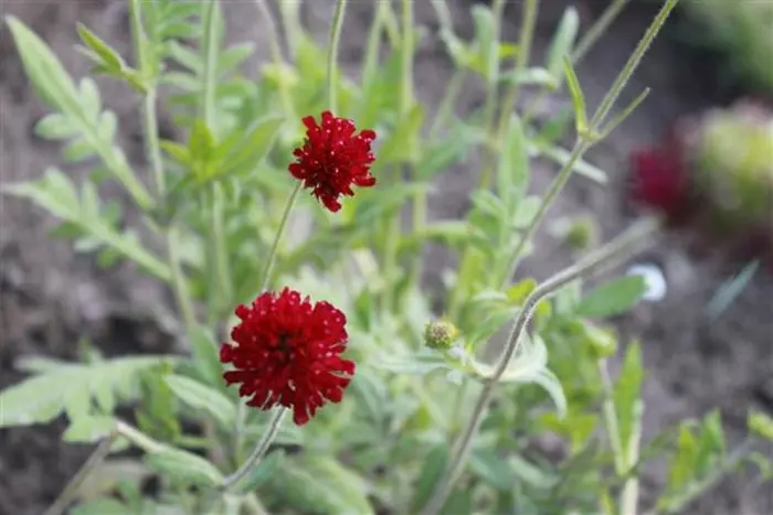 Knautia macedonica 'Red Knight' is een opgaande plant met geveerde basale bladeren en een overvloed aan donkerrode bloemhoofdjes in de zomer.