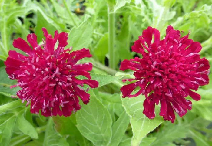 Knautia macedonica bloeit met meerdere kleine donkerrode pompons .