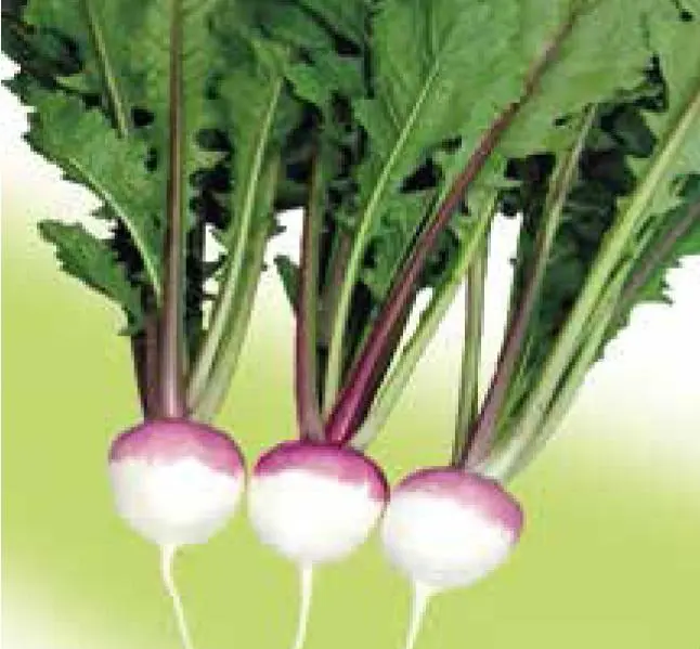 Is een rood/witte raap met wit vlezig vruchtvlees, ook het jong blad is eetbaar.