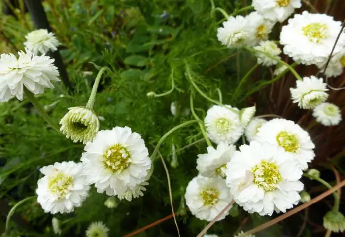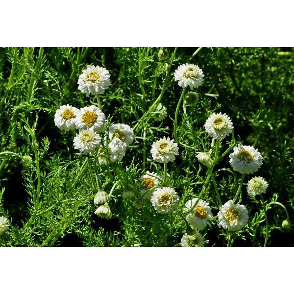 Chamaemelum nobile 'Ligulosum' bloeit met gevulde witte kamillebloempjes.