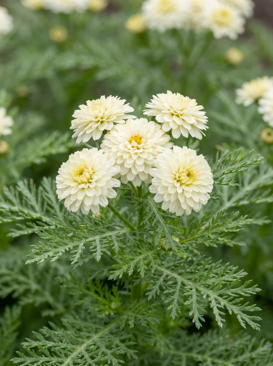 Chamaemelum nobile 'Ligulosum' bloeit met gevulde witte kamillebloempjes.