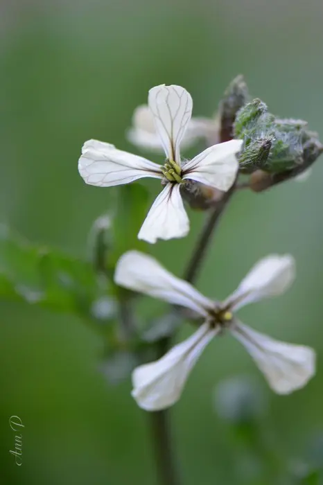 Een sla met groen blad gelijkend op dat van de paardebloem en wit met purpergeaderde bloemen.
