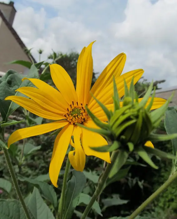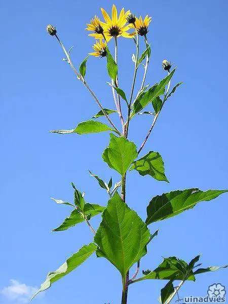 Helianthus tuberosus bloeit met gele margrietachtige bloemen op zeer hoge stelen.