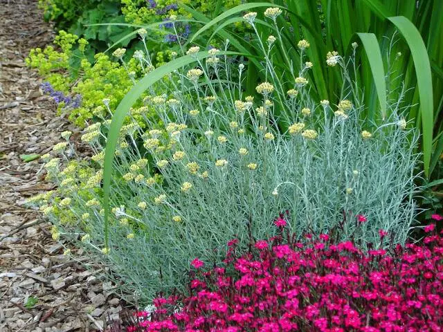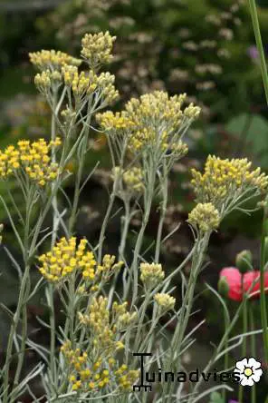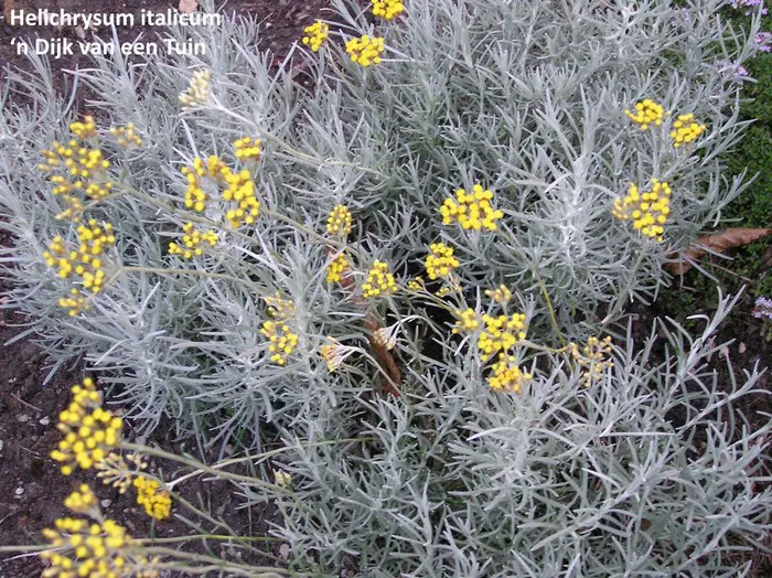 Helichrysum angustifolium is een mediterrane struikachtige vaste plant met goudgele bloemen en prachtig groenblijvend grijs blad. De naaldvormige blaadjes lijken op die van de lavendel.