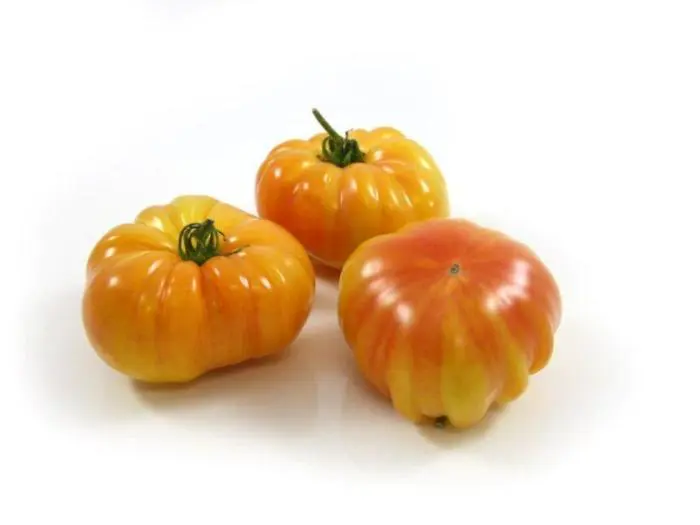 Het kleurenpalet van deze speciale tomaten bestaat uit geel, groen en rood. De plant draagt zeer grote vruchten met weinig zaadjes in.