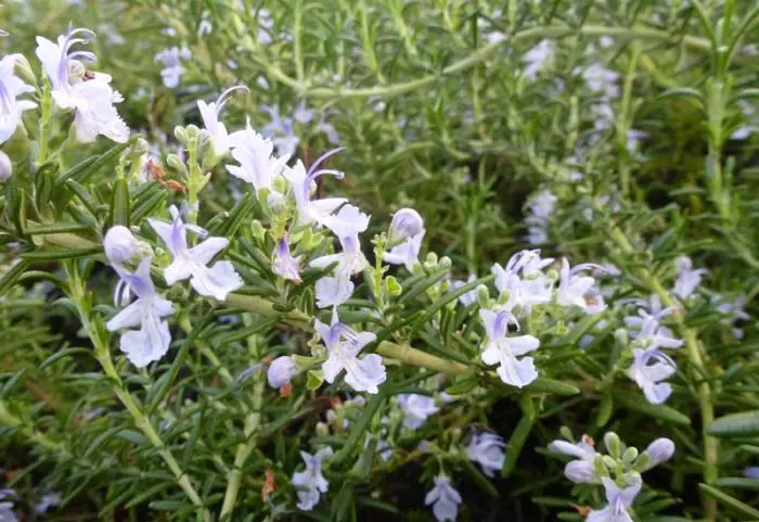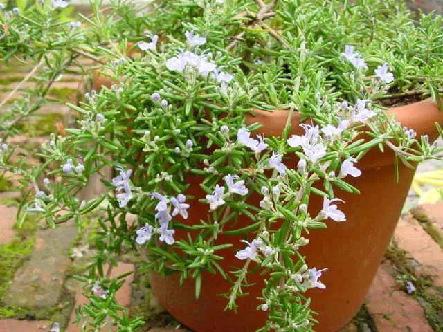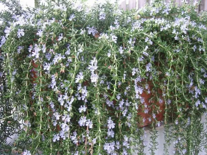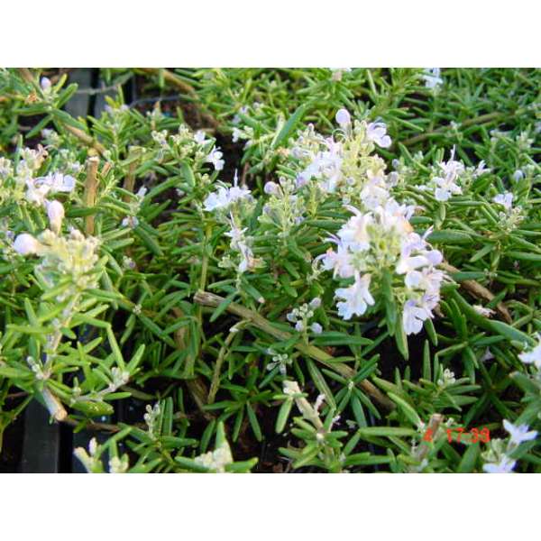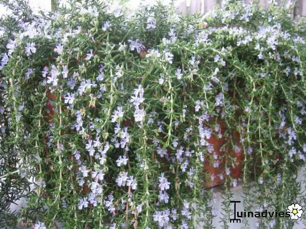 Rosmarinus officinalis (Prostratus Group) 'Capri' is een mooi kruipend plantje dat best in pot gekweekt wordt daar ze niet volledig winterhard is.