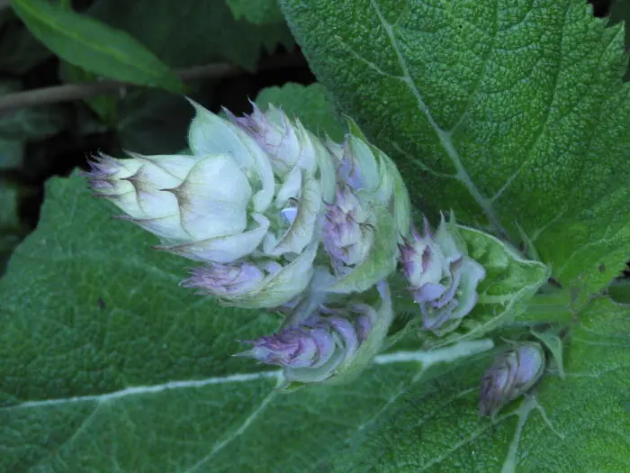 Bloeit rijkelijk met lange aren van talrijke bleek grijsblauwe/creme bloemen met rozewitte schutbladeren. Deze bloemen verspreiden een krachtige geur.