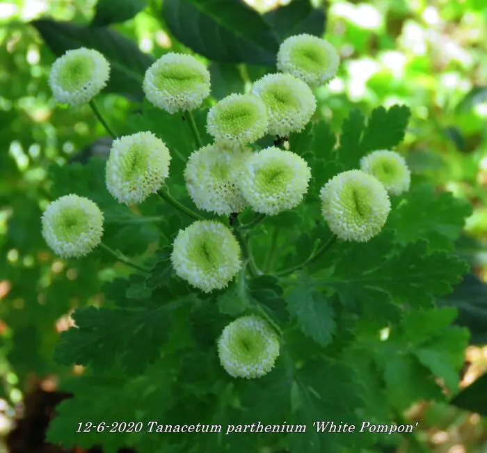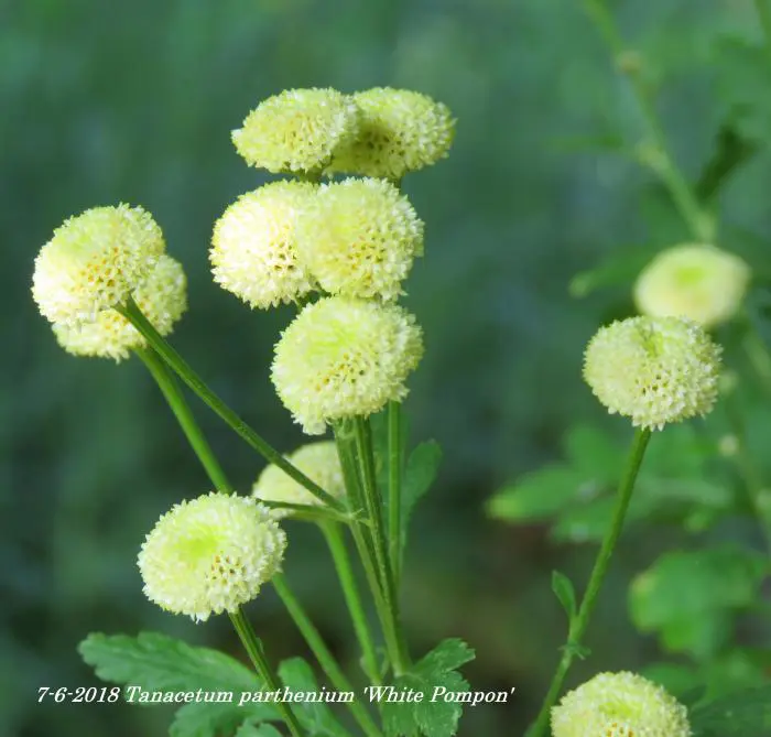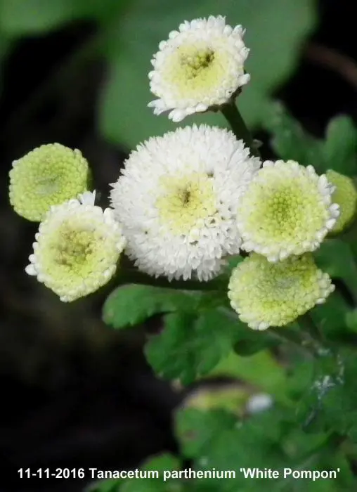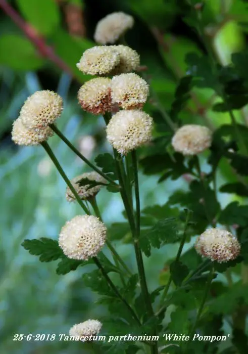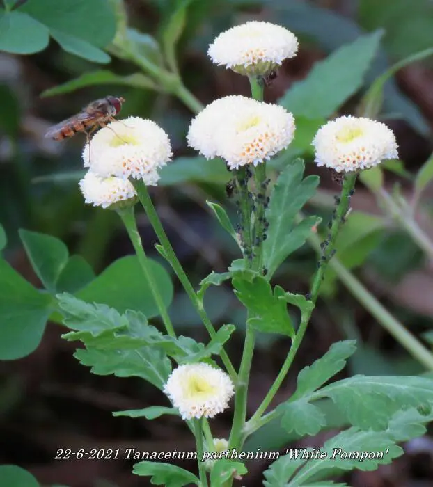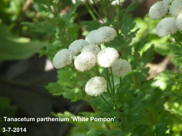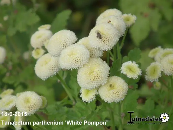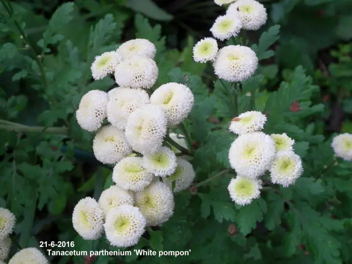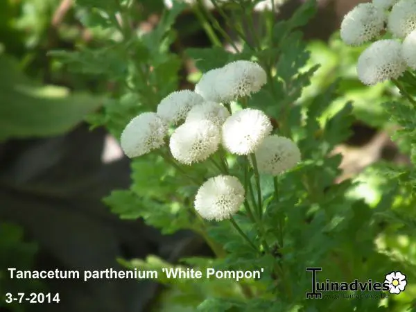 Tanacetum parthenium 'White Pompon' bloeit met kleine witte pomponnetjes.
