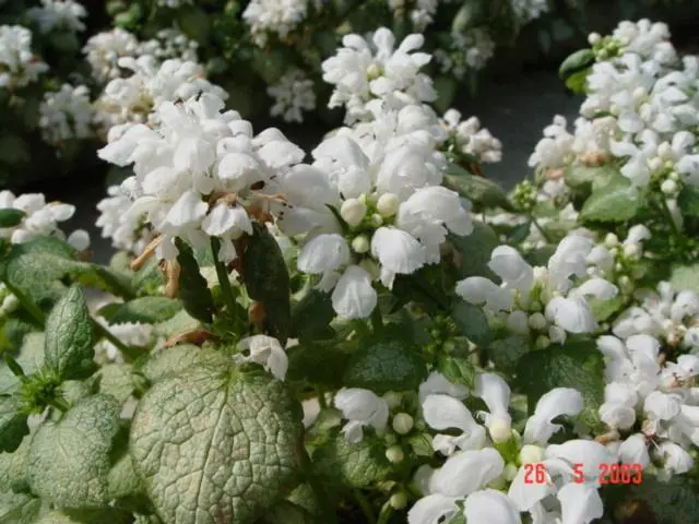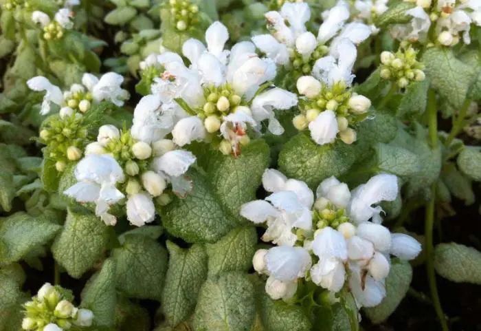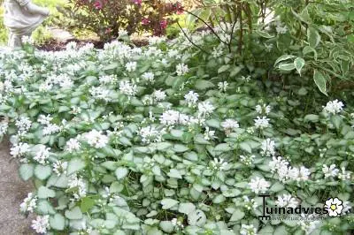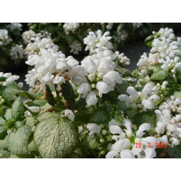 Lamium maculatum 'White Nancy' heeft een zilvergroen blad met een witte bloei.