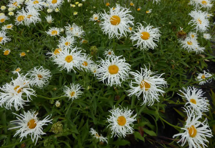 Het is een robuuste vaste plant met grote witte straalbloemen met lange dunne draadachtige gedraaide bloemblaadjes rond een grote gele schijf in het centrum.