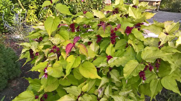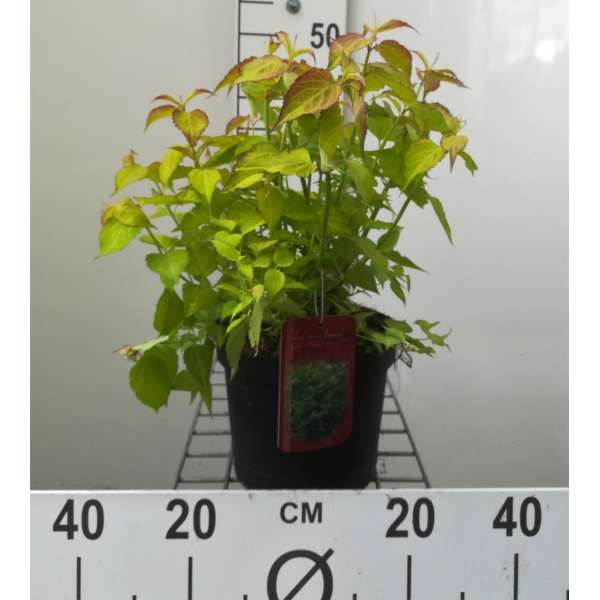 Een exotische halfheester vormt een bossige opgaand groeiende struik met opvallende goudgeel bladeren.
