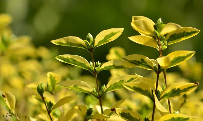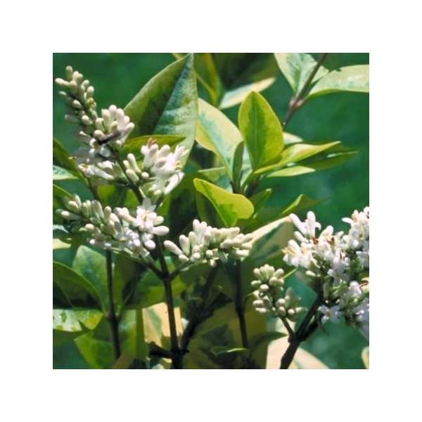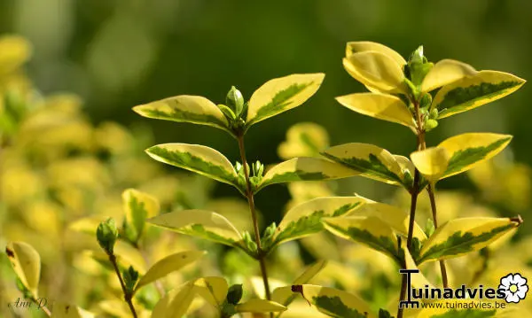 Ligustrum ovalifolium 'Aureum' bloeit met geurende witte bloempjes gevolgd door zwarte bessen tenzij ze als haag gesnoeid worden dan blijft de bloei uit.