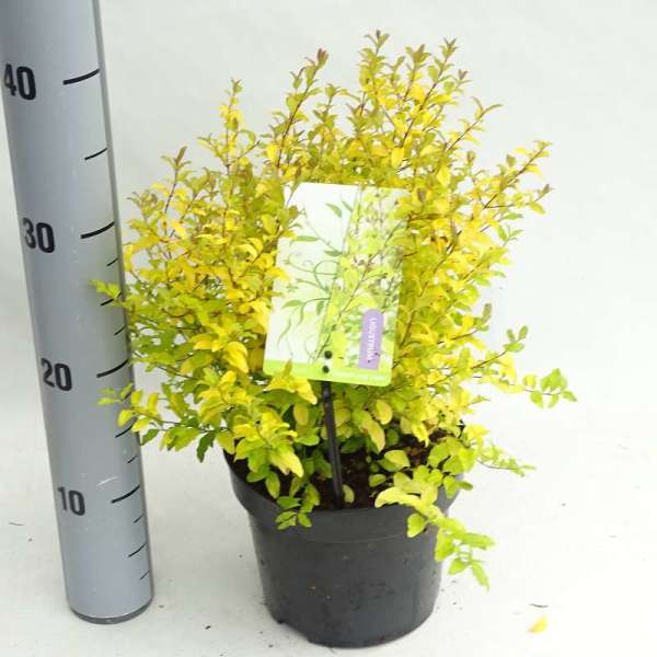 Ligustrum ovalifolium 'Lemon and Lime' bloeit met geurende witte bloempjes gevolgd door zwarte bessen tenzij ze als haag gesnoeid worden dan blijft de bloei uit.