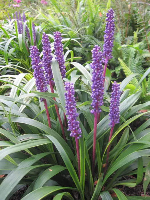 Liriope muscari 'Gold Band' vormt een pol van grasachtige, geel/groen bontgekleurde bladeren en bloeit met prachtige rechtopstaande violetpaarse aren.